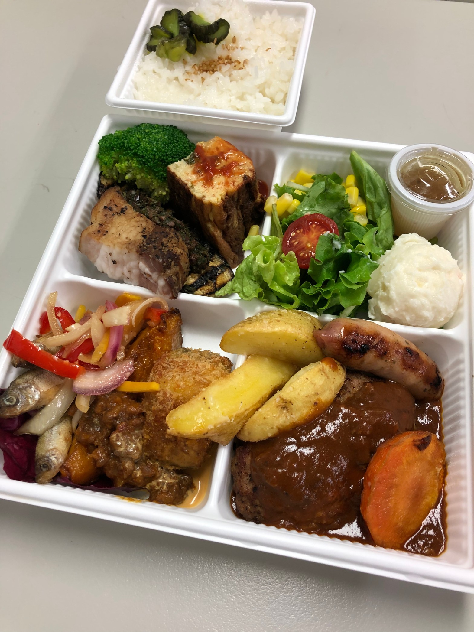 ハンバーグ・魚・野菜と栄養満点の内容で、特に焼きナスにバジルソース?をかけた一品が最高でした。(多分バジル系のソースです。自信はありません。)