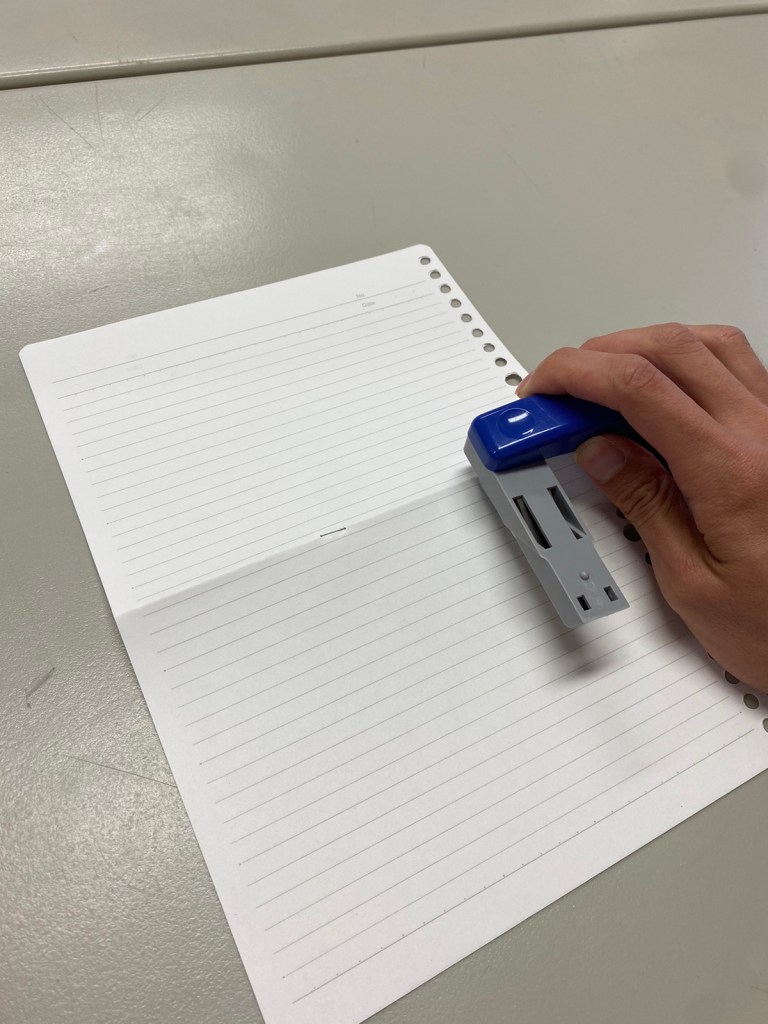 冊子を作るには、この折り目の山の部分をピッタリにホッチキスで留めなければならないのですが、それがなかなか難しく最初は苦戦しました。