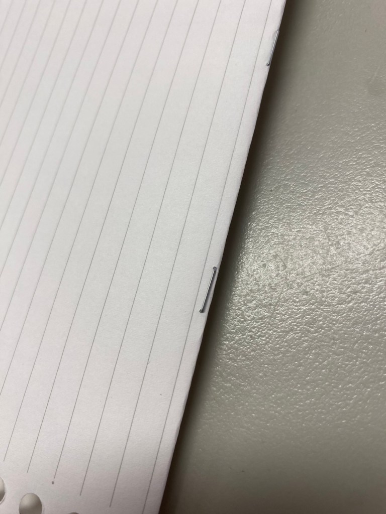 折り目の山からズレるとこの様な有様になります… 折り目の位置を慎重に確認し、一度軽く挟んで留める位置を想定してから、強く挟んでホッチキスで留めます。