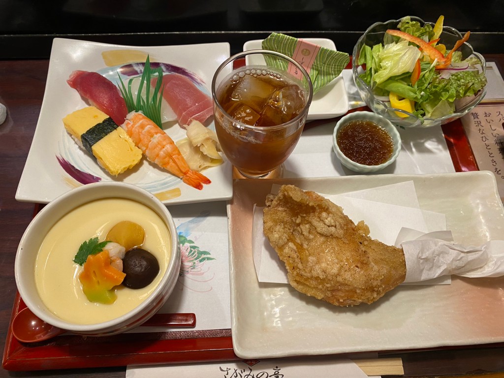 茶碗蒸しですが、 湯呑みサイズだとイメージしていましたが、お抹茶をたてる様な茶碗サイズで驚きました。 “茶碗”蒸しなので本物の茶碗蒸しはこのサイズ感なのですね。 ダシが効いていて、いい味が身に沁みます。 そして栗、銀杏、椎茸、紅葉形のお麩が秋の訪れを感じさせてくれました。