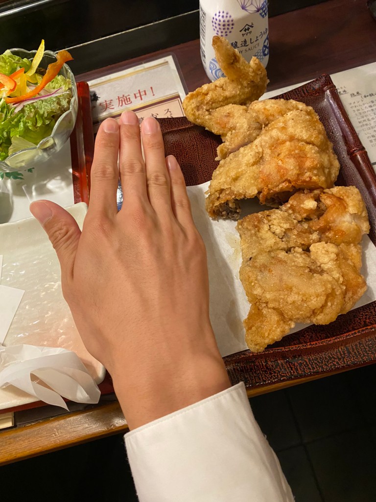 名物若鶏のから揚げは名物だけあって絶品です。 クリスマスで頂くチキンのようなサイズ感 絶妙な衣加減と揚げ具合でパリッパリです。